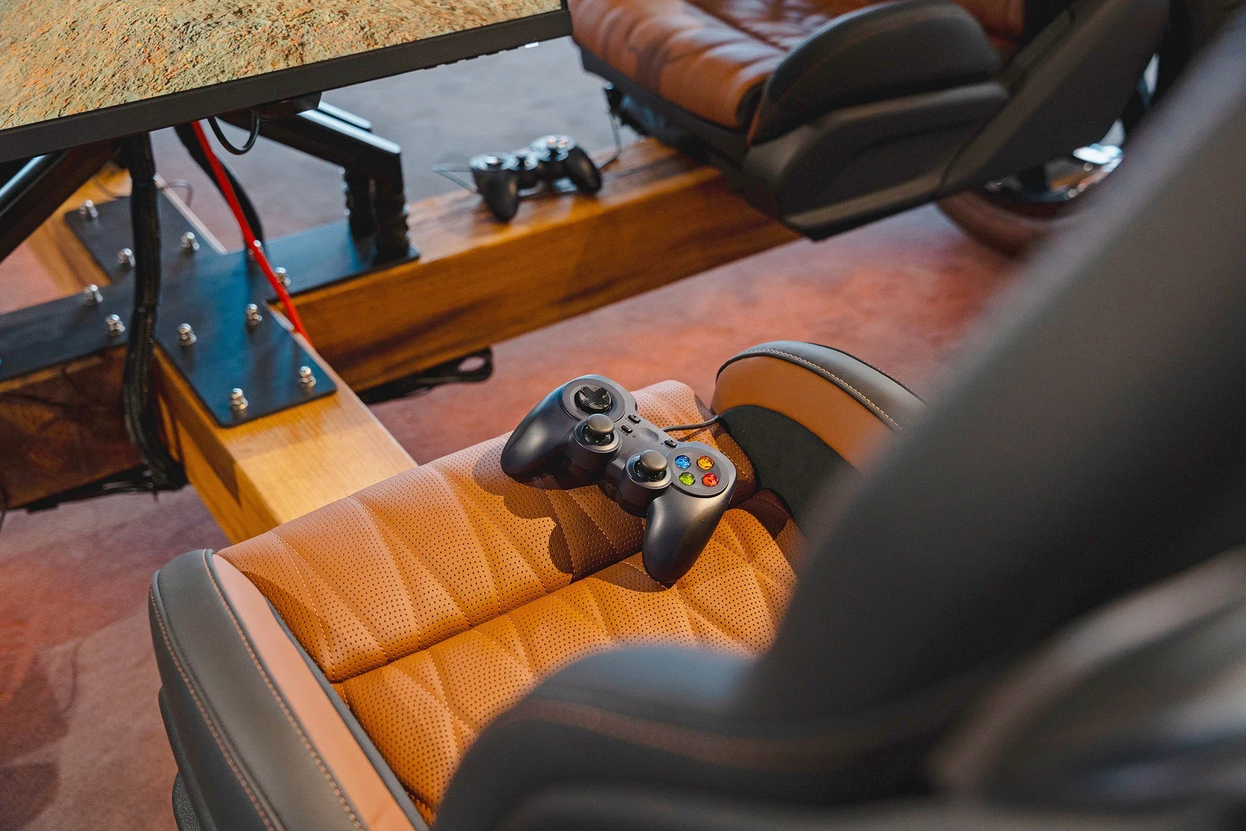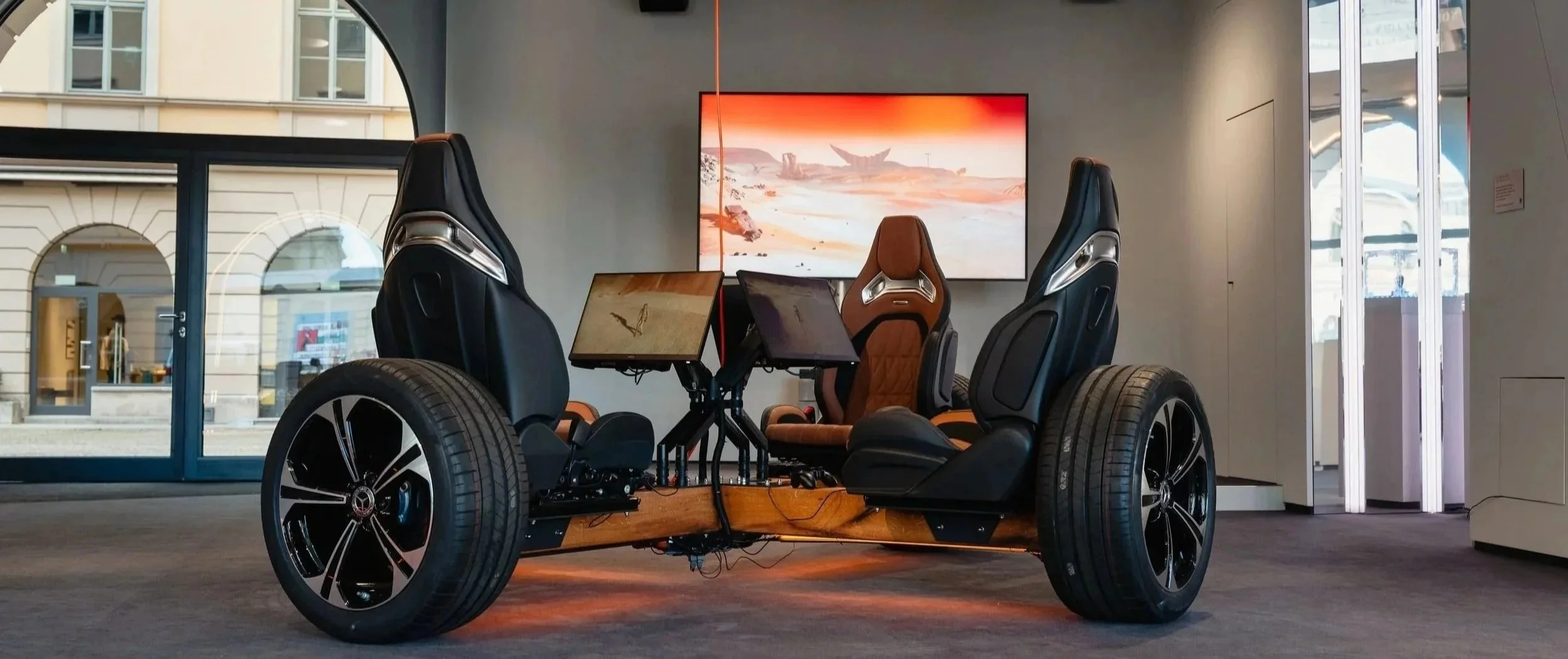 The project was developed into a four-player MK-II configuration, integrating Mercedes-AMG materials into the sculptural gaming structure.